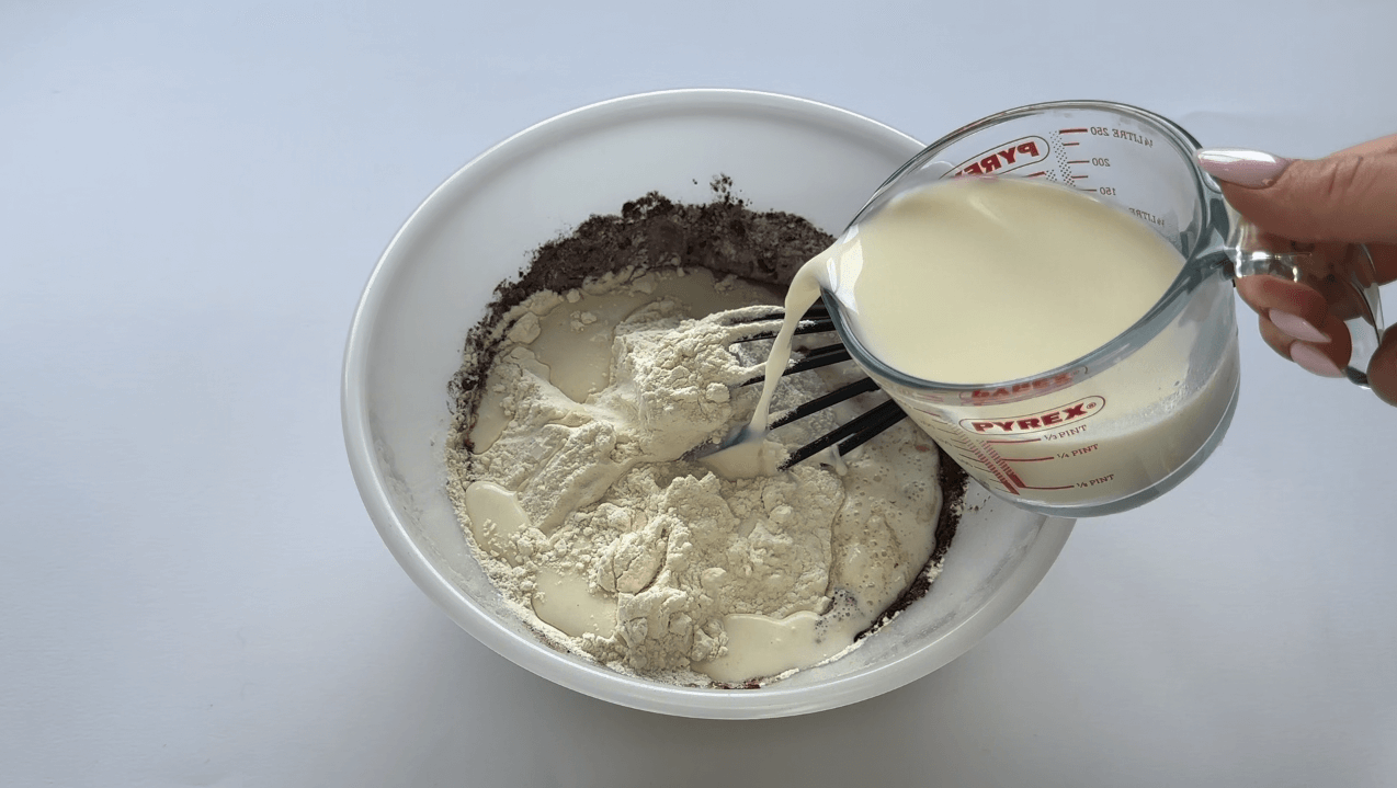Pour in the milk and olive oil. Mix until the ingredients are well combined.