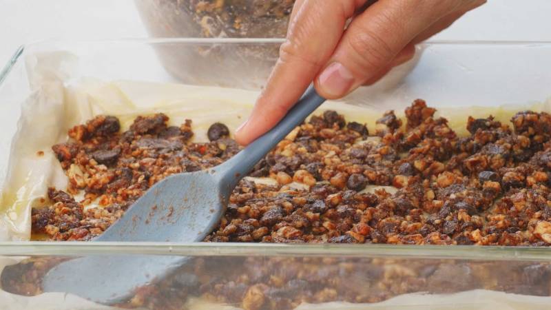 Spread half of the nut filling evenly over the stacked filo dough sheets. Repeat the layering process with 8 more sheets of filo dough and the remaining nut filling.