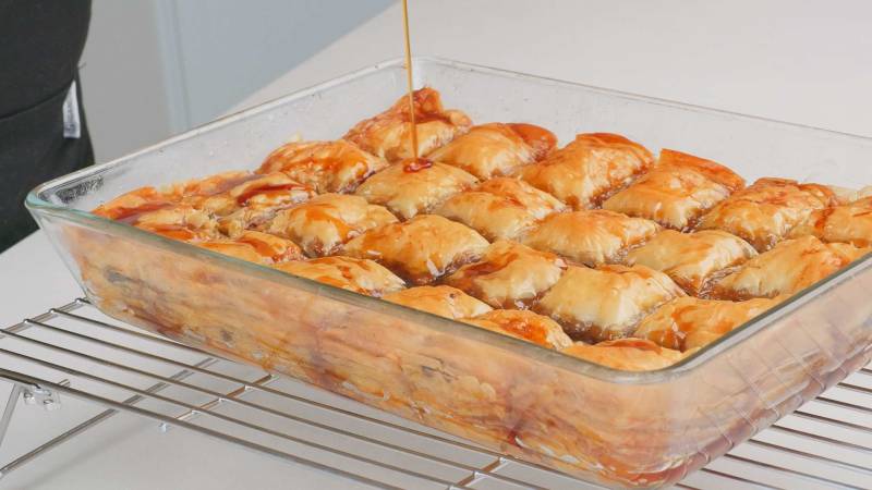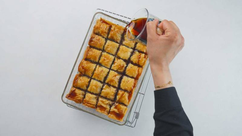 Immediately after baking, pour the prepared syrup over the hot baklava, ensuring it is evenly distributed.