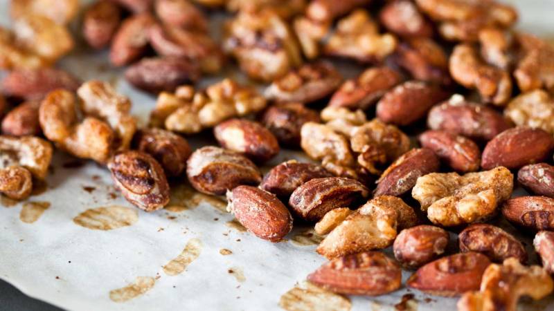 Roast the walnuts and almonds in a preheated oven at 160°C for 10 to 15 minutes. Once roasted, set aside.