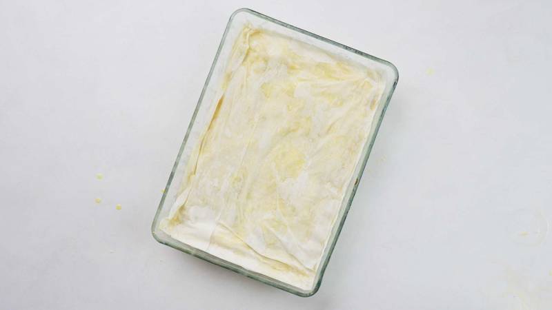 Melt the unsalted butter and unwrap the filo dough. Place one sheet of filo dough on a work surface and brush it lightly with melted butter, ensuring to cover the corners. Fold it in half and place it in the greased baking dish. Repeat with 9 more sheets, stacking them on top of each other.