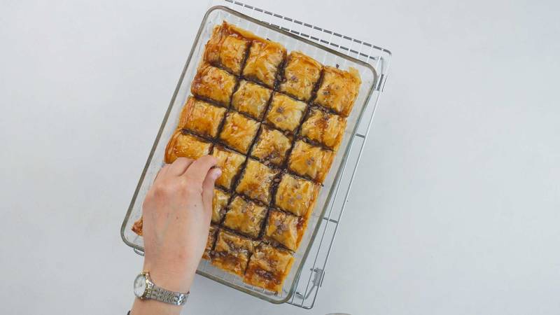 Let the baklava cool completely in the baking dish. Once cooled, decorate the baklava pieces with chopped chocolate