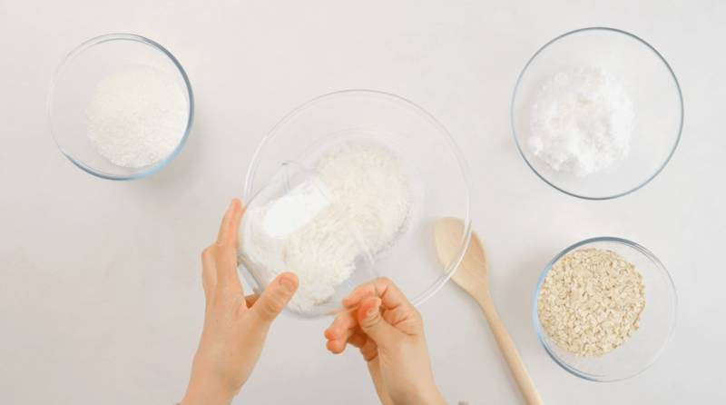 In a large mixing bowl, combine the coconut, flour, sugar, and oatmeal. Stir with a wooden spoon.