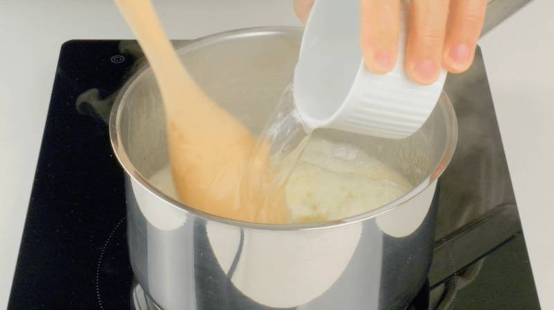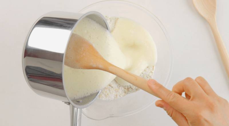 Mix the baking powder with warm water and add it to the melted butter mixture. The mixture will foam. Stir well.