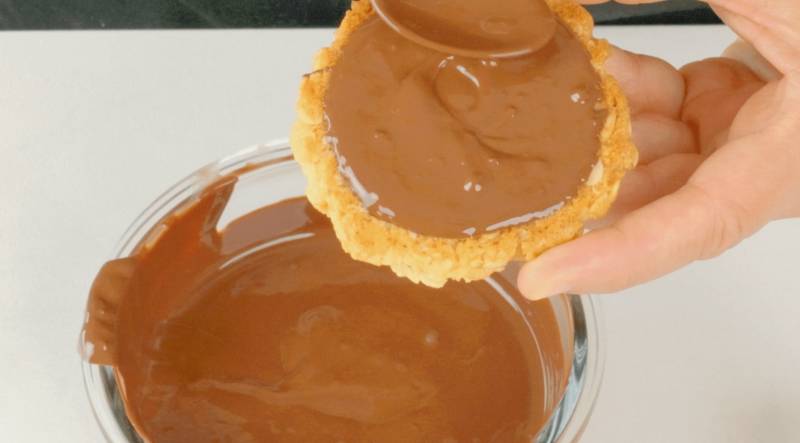 Melt the dark chocolate drops in the microwave. Turn the cooled cookies over, and use a spatula or teaspoon to spread melted chocolate on the bottom. Place the cookies in the refrigerator to set the chocolate.