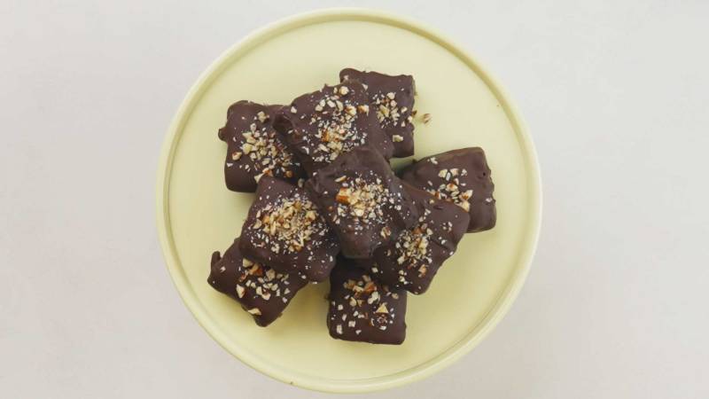Place the dipped cookies on a baking sheet lined with parchment paper and decorate each cookie with chopped pecans. Place the cookies in the refrigerator for the chocolate to set.