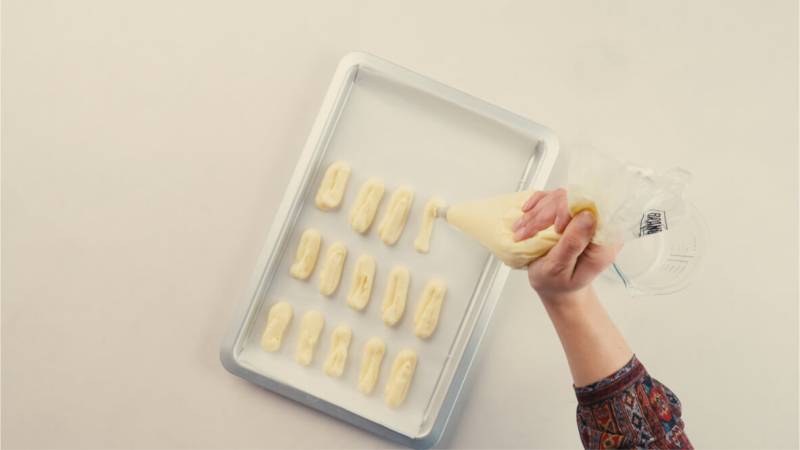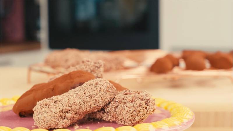 Line a plate or bowl with baking paper and transfer the filling to a piping bag with a smooth nozzle. Pipe elongated truffles onto the baking paper. Place the plate with the piped truffles in the freezer for at least 1 hour (longer is fine).